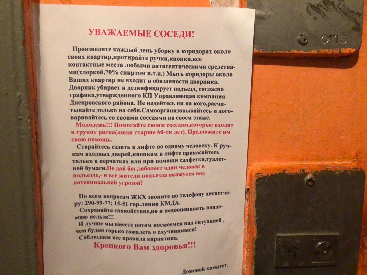 Известно, что в некоторых столичных домах жители дополнительно собирают деньги на специальные средства, поскольку считают, что стандартной дезинфекции от коммунальных служб недостаточно. Представители домовых комитетов просят самостоятельно обрабатывать поверхности около своих квартир - кнопки, ручки и все контактные места. Также инициативная часть киевлян просит оказывать помощь соседям пожилого возраста, а кнопки лифта нажимать только в перчатках или с помощью салфетки.