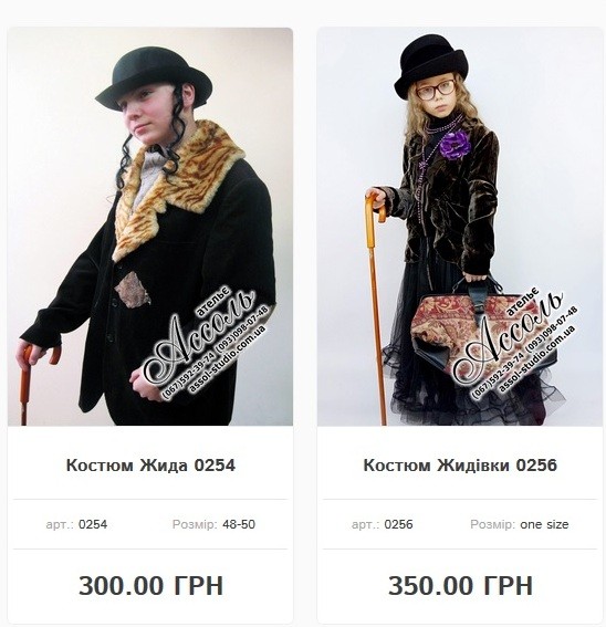 Расположенное во Львове дизайнерское ателье по пошиву одежды "Ассоль" представило в ассортименте "Костюм жида" и "Костюм жидовки", разместив, соответствующие фотографии товаров. Стоимость данных костюмов 300 и 350 гривен.