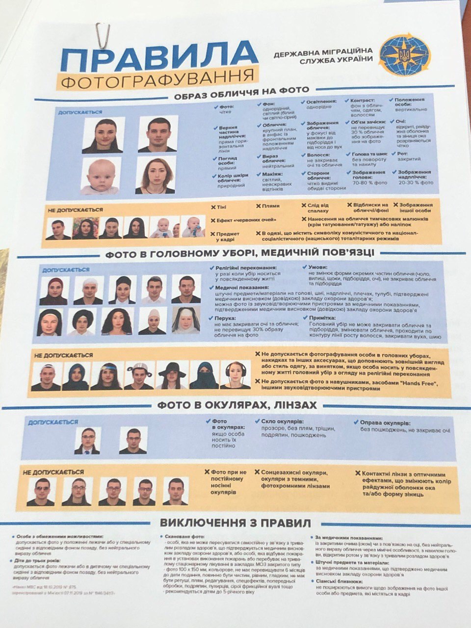 По словам председателя Государственной миграционной службы Максима Соколюка, в новом приказе четко прописаны все нормы. Сейчас можно фотографироваться в головном уборе, в очках, линзах или в медицинской повязке, если это используется в повседневной жизни. Главное, чтобы не закрывалось лицо и подбородок, не менялась форма отдельных частей (лоб, скулы, щеки, глаза).