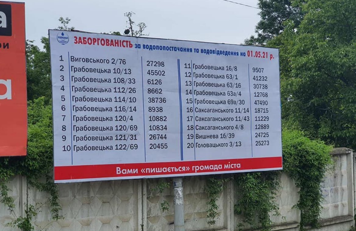 Кроме места жительства и номеров домов, на щитах указана соответствующая сумма долга перед водоканалом. Телеграмм-канал "Типовий Львів" 8 июня опубликовал соответствующее фото.