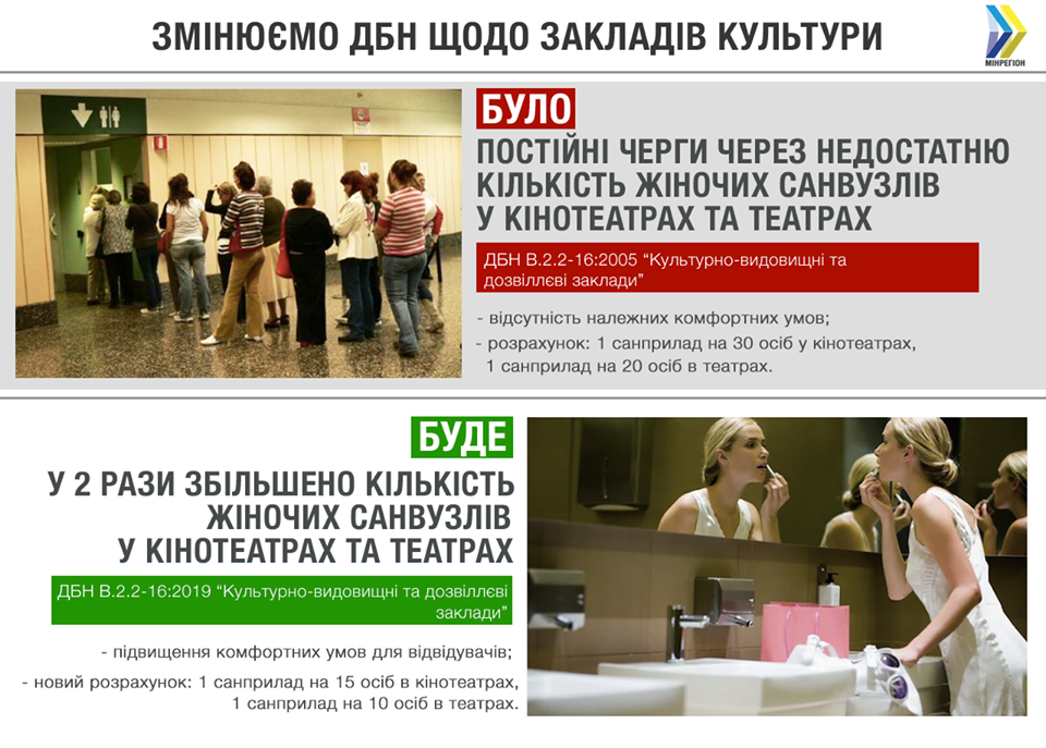 Дело касается новых строительных норм заведений культуры. По этим нормам количество женских уборных в кинотеатрах и театрах должно быть увеличено вдвое.