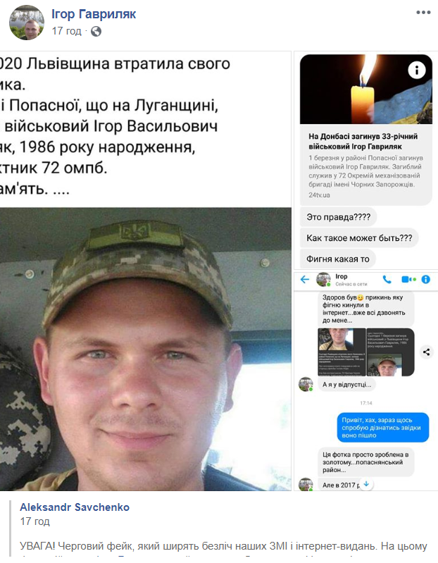 Львовянин Игорь Гавриляк, который якобы погиб 1 марта на Донбассе, оказался живым. В сети распространили фейк.