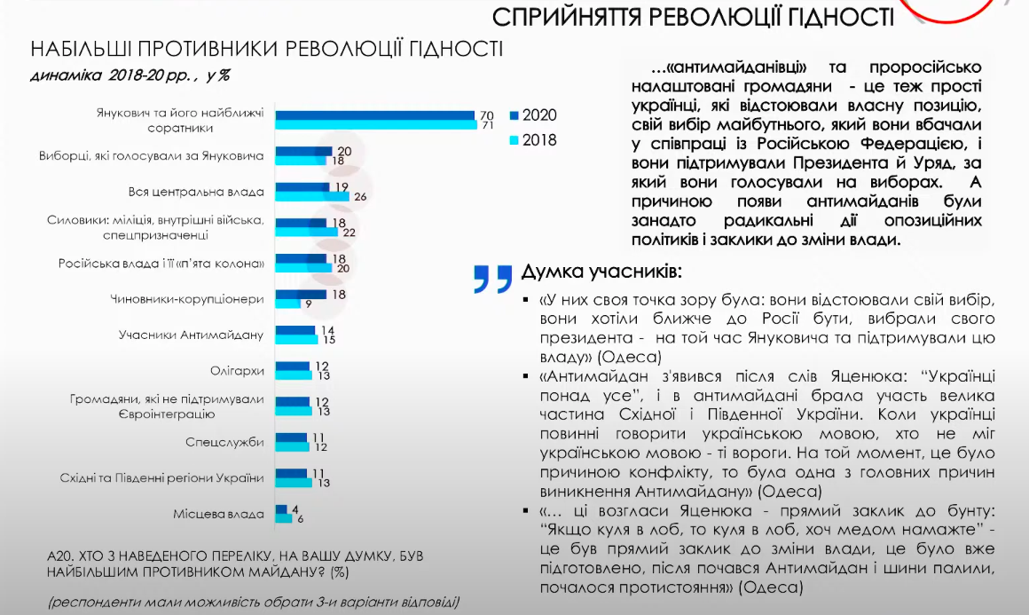 В Киеве 22 февраля презентовали результаты исследования об отношении украинцев к Революции Достоинства. В частности, среди других исследований восприятия событий майдана, были названы крупнейших противников революции 2014 года.