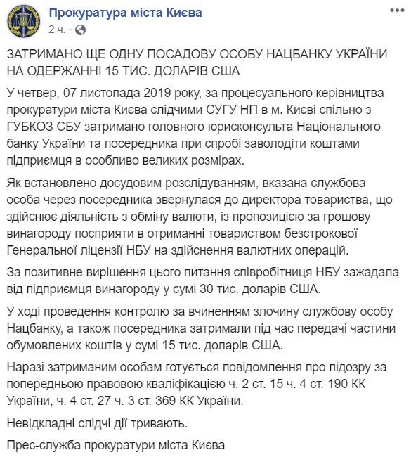 "Национальный банк пока не получил от правоохранительных органов детальной информации о задержании работницы, о котором сегодня вечером сообщено на сайте и на страницах в социальных сетях Национальной полиции города Киева и прокуратуры города Киева. Мы выясняем обстоятельства задержания и после получения уточненной информации предоставим развернутый комментарий", - написано в соцсети.