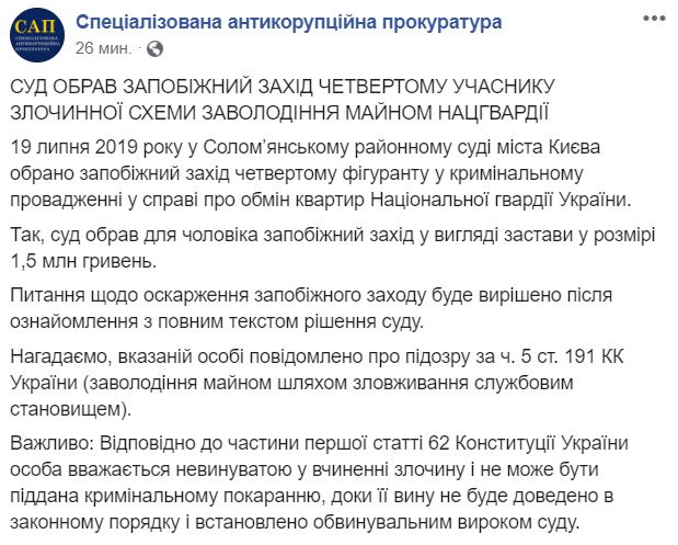 19 июля 2019 года в Соломенском районном суде города Киева избрана мера пресечения четвертому фигуранту в уголовном производстве по делу об обмене квартир Национальной гвардии Украины.