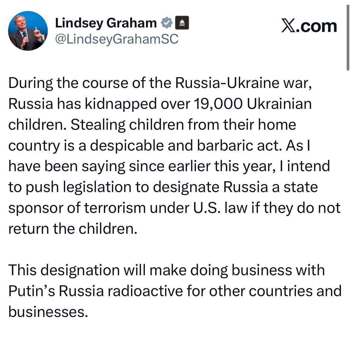 Сенатор Соединённых Штатов Линдси Грэм резко осудил похищение россией украинских детей, назвав этот преступный акт варварским. Он чётко заявил: если дети не будут возвращены, он будет продвигать инициативу о признании россии государством-спонсором терроризма.
