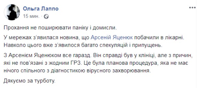 Пресс-секретарь Яценюка Ольга Лаппо отметила в Facebook, что политик был в клинике не из-за серьезных болезней. Она попросила не сеять панику и не распространять домыслы. «Это была плановая процедура, которая не имеет ничего общего с диагностикой вирусного заболевания. Спасибо за заботу», - добавила Лаппо.