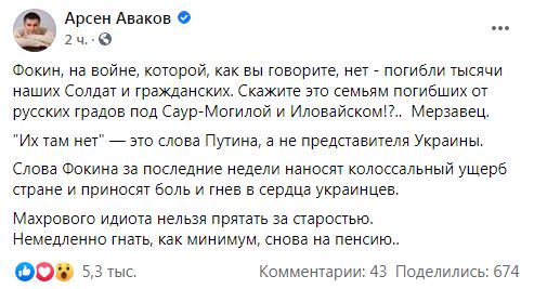 "Фокин, на войне, которой, как вы говорите, нет — погибли тысячи наших солдат и гражданских. Скажите это семьям погибших от русских градов под Саур-Могилой и Иловайском!", -пишет Аваков.