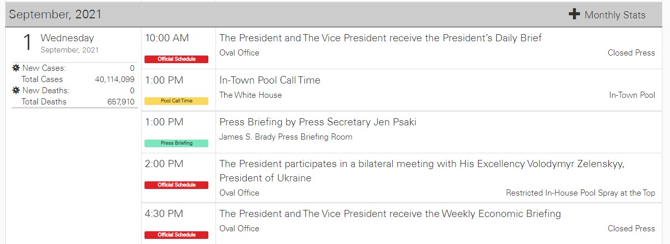 Продолжается визит украинской делегации во главе с Зеленским в США. Об этом 1 сентября говорится в публичном расписании американского лидера.