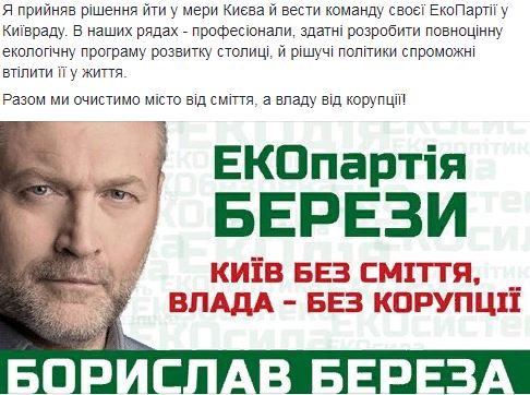 "Я принял решение идти в мэры Киева и вести команду своей ЭкоПартии в Киевсовет. В наших рядах — профессионалы, способные разработать полноценную экологическую программу развития столицы, и решительные политики, способные воплотить ее в жизнь. Вместе мы очистим город от мусора, а власть от коррупции!", - отметил Береза в своем обращении к киевлянам.