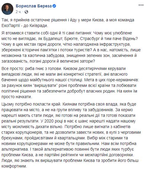 "Да, я принял окончательное решение и иду в мэры Киева, а моя команда ЭкоПартии - в Киевсовет. Я устал задавать себе одни и те же вопросы: Почему мой любимый город не выглядит, как Будапешт, Брюгге, Страсбург и тем более Вена? Почему в этих городах хорошие дороги, четко налаженная инфраструктура, сохранены исторические памятники и потоки туристов? А у нас, зато, только незаконная и хаотичная застройка, уничтожение зеленых зон, засор и загазованность, плохие дороги и огромные пробки?", - пишет Береза в своем заявлении, опубликованном сегодня в Facebook.