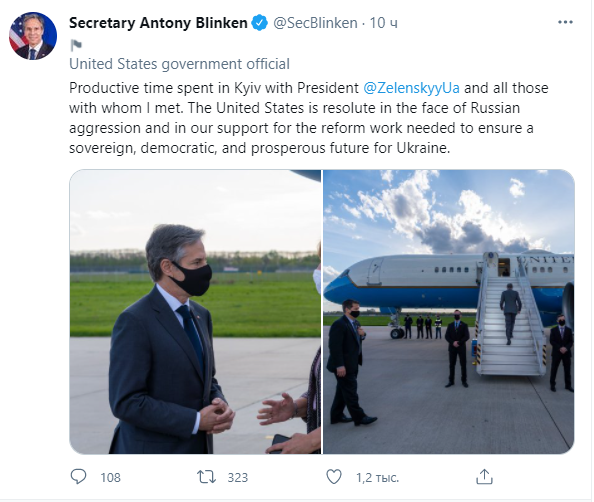 Государственный секретарь США Энтони Блинкен считает результативным свой долгожданный визит в Украину. В своем аккаунте в Twitter Блинкен написал, что продуктивно провел время в Киеве с президентом Владимиром Зеленским и всеми, с кем встречался.