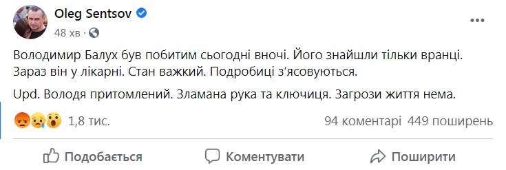Сенцов позже добавил, что Балух был в сознании. Правоохранители устанавливают все обстоятельства нападения.