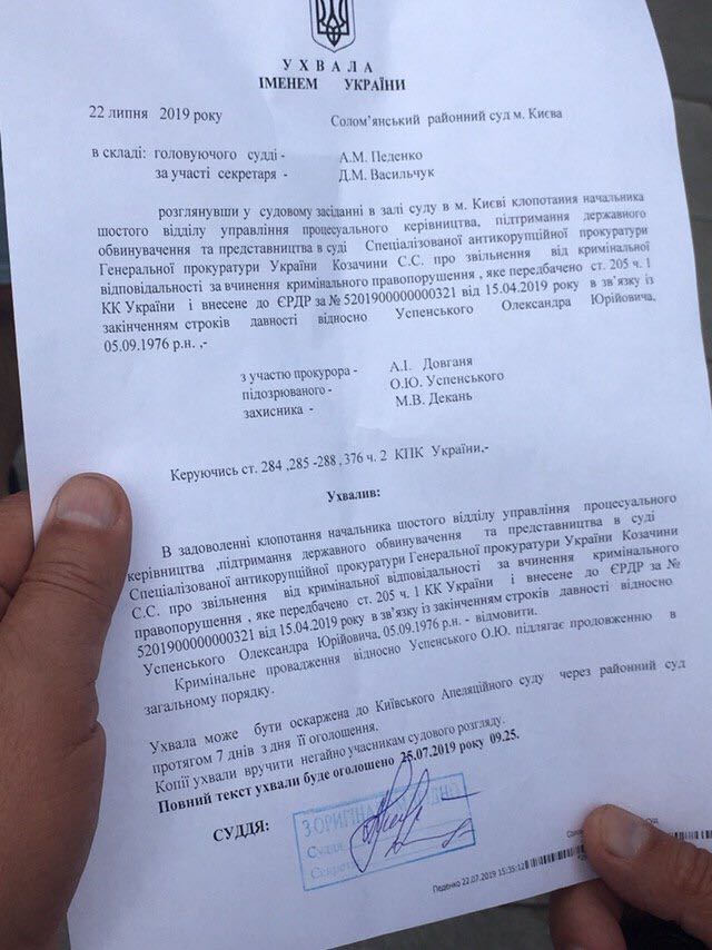 "Однако 24 апреля 2019, в день, когда САП подала ходатайство об освобождении от ответственности Успенского, руководитель САП Назар Холодницкий резко изменил группу прокуроров, занимавшихся делом. Впоследствии 4 июня 2019 заместитель Холодницкого Владимир Кривенко неожиданно отозвал ходатайство и захотел, чтобы следствие по делу продолжилось, хотя касательно "пешки" Успенского по закону должны были закрыть дело", - отмечают в ЦПК.