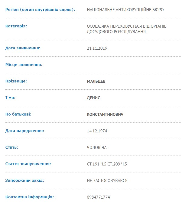 Сегодня, 29 ноября, стало известно, что Антикоррупционное бюро объявило в розыск экс-главу правления VAB Банка Дениса Мальцева.