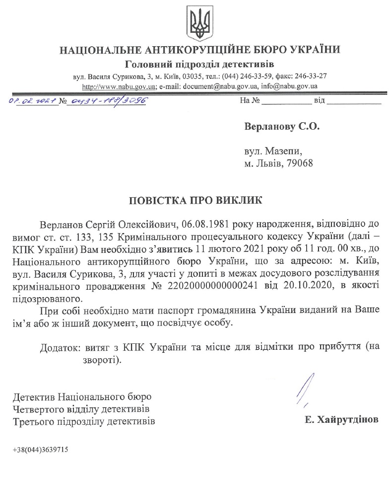 "Повестка о вызове Верланов Сергея Алексеевича, 6.08.1981 года рождения, Вам необходимо прибыть 11 февраля 2021 в 11:00, в Национальный антикоррупционного бюро Украины по адресу: г.. Киев, ул. Василия Сурикова, 3, для участия в допросе в пределах досудебного расследования в уголовном производстве № 22020000000000221 от 20.10.2020 ", - говорится в сообщении НАБУ.