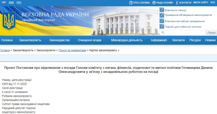 36 народных депутатов выступили инициаторами постановления 4393 вот 17.11.2020. В постановлении причиной для отставки Гетманцева указана эго "неудовлетворительная работа" в данной должности. Сам текст документа на сайте Верховной Рады не опубликован.