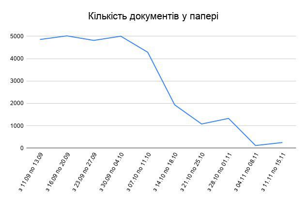Согласно инфографике, опубликованной Дубилетом, количество документов, которые министерства и другие центральные органы направили друг другу в бумажной форме, существенно снизилось с 1 октября.