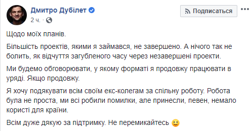 "Большинство проектов, которыми я занимался, не завершено. А ничего так не болит, как ощущение потерянного времени из-за незавершенных проектов. Мы будем обсуждать, в каком формате я продолжу работать в правительстве. Если продолжу", - написал Дубилет.