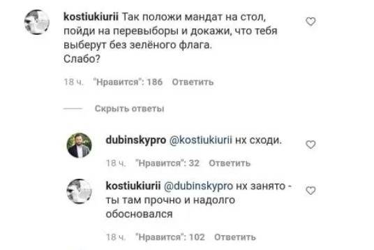 В треде отписался также заместитель главы Офиса президента Юрий Костюк. Чиновник предложил Дубинского отказаться от мандата. "Так положи мандат на стол, пойди на перевыборы и докажи, что тебя выберут без зелёного флага. Слабо?", написал Костюк.
