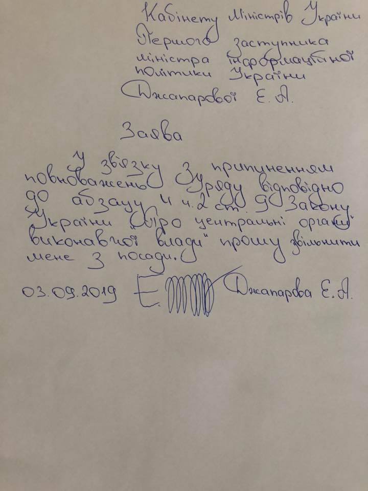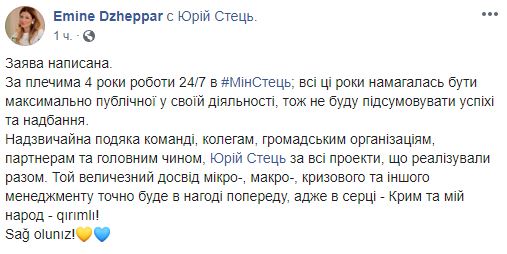 Первая заместительница министра информационной политики Украины Эмине Джапарова написала заявление об увольнении.
