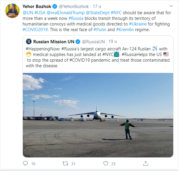 "ООН, президент США Дональд Трамп, Государственный департамент должны знать, что уже больше недели Россия блокирует транзит гуманитарного груза товаров медицинского назначения для Украины во время борьбы с COVID-19", — написал Егор Божок.