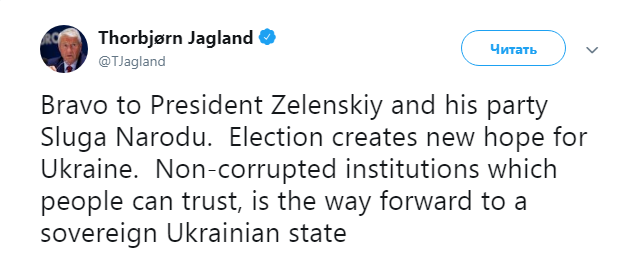 "Браво президенту Зеленскому и его партии "Слуга народа". Выборы создают новую надежду для Украины. Не коррумпированные институты, которым люди могут доверять, - это путь к суверенному украинскому государству", - написал Ягланд.