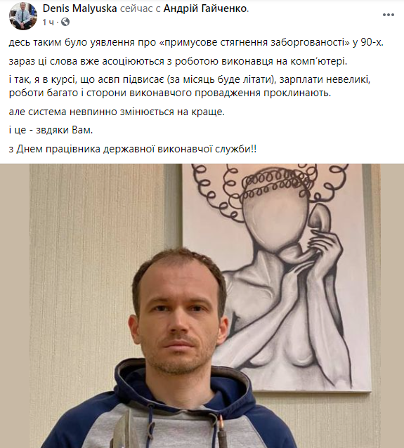 Министр юстиции Денис Малюська поздравил работников государственной исполнительной службы с их профессиональным праздником, который отмечается 17 декабря. Министр указал на своей странице в Facebook, с помощью каких средств происходило принудительное взыскание задолженности в 90-х.
