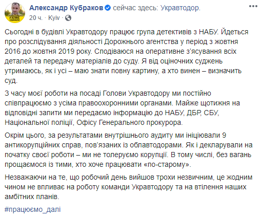 Глава Укравтодора Александр Кубраков написал в соцсети, что накануне в здании Дорожного агентства работала группа детективов из Национального антикоррупционного бюро. По словам Кубракова, речь идет о расследовании деятельности Дорожного агентства в период с октября 2016 по октябрь 2019 года. Нынешний глава Укравтодора выразил надежду на оперативное выяснение всех деталей и передачу материалов в суд. Он сообщил, что Укравтодор постоянно сотрудничает со всеми правоохранительными органами. Почти каждую неделю на соответствующие запросы передается информация в НАБУ, ГБР, СБУ, Национальную полицию, Офис Генерального прокурора. Также по результатам внутреннего аудита инициировано девять антикоррупционных дел, связанных с облавтодорами.