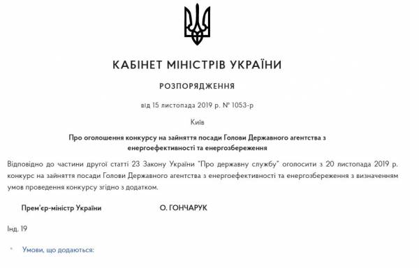 "Согласно части второй статьи 23 Закона Украины "О государственной службе" объявить с 20 ноября 2019 г. конкурс на занятие должности Председателя Государственного агентства по энергоэффективности и энергосбережению с определением условий проведения конкурса согласно приложению", - гласит распоряжение главы Кабмина Украины.