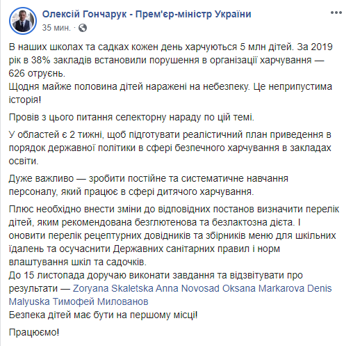 "В наших школах и садиках каждый день питаются 5 млн детей. За 2019 год в 38% учреждений установили нарушения в организации питания - 626 отравлений. Ежедневно почти половина детей подвержены опасности. Это недопустимая история! Провел по этому вопросу селекторное совещание по этой теме", - написал Гончарук.