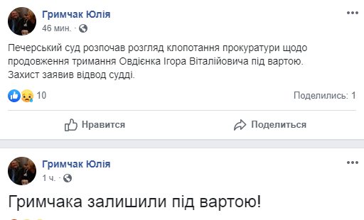 "Грымчака оставили под стражей!", - написала Юлия.