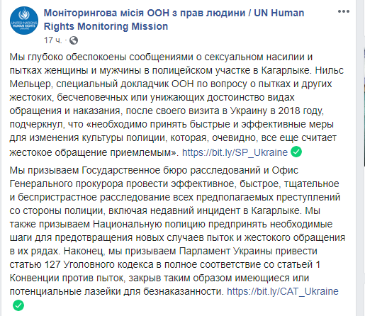 В Организации Объединеных Наций призвали Украину тщательно расследовать изнасилование и пытки в отделении полиции в Кагарлыке. Заявление было размещено на странице в Facebook мониторинговой миссии ООН в Украине в четверг, 28 мая.