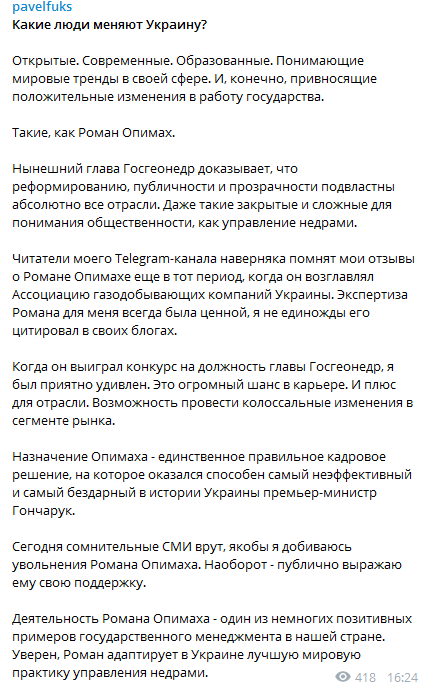 Известный украинский бизнесмен и меценат Павел Фукс в своем Телеграм-канале рассказал о нынешнем главе Госгеонедр Романе Опимахе. Фукс отметил, что Опимах своей работой доказывает, что реформированию, публичности и прозрачности подвластны абсолютно все отрасли, в том числе и такие закрытые и сложные для понимания общественности, как управление недрами. Фукс назвал решение о назначении Опимаха – единственным правильным кадровым решением, на которое оказался способен бывший премьер-министр Гончарук. Фукс опроверг информацию некоторых СМИ о том, что он якобы добивается увольнения Романа Опимаха. Наоборот, отметил, Фукс, он публично выражил Опимаху свою поддержку. Павел Фукс назвал деятельность Романа Опимаха одним из немногих позитивных примеров государственного менеджмента в Украине.