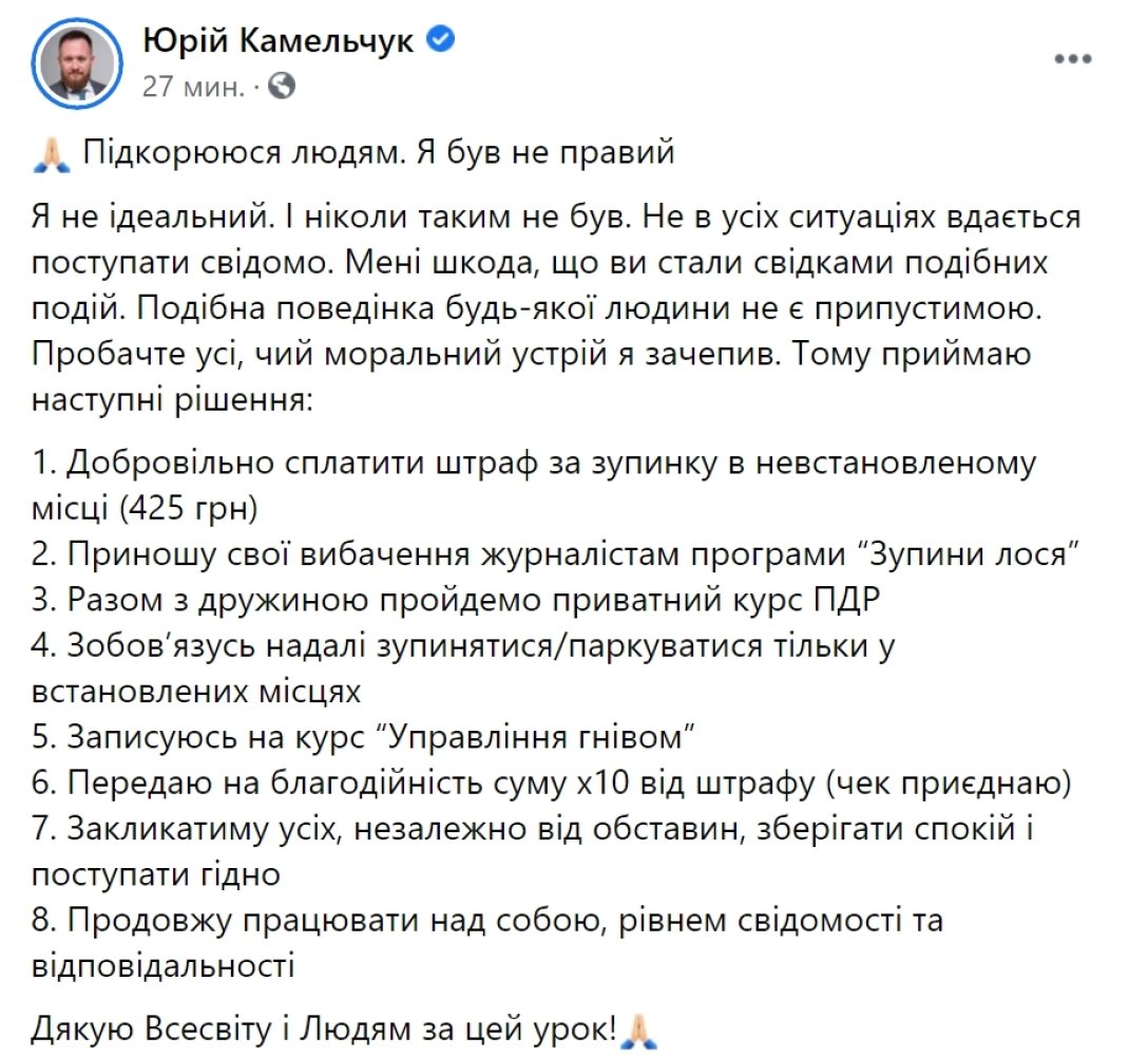 Нардеп написал, что добровольно выплатит штраф за остановку в неположенном месте в размере 425 гривен. Также он передаст на благотворительность в десять раз большую сумму. "Подчиняюсь людям, я был неправ. Я не идеален. И никогда таким не был. Не во всех ситуациях удается совершать поступки сознательно... Мне жаль, что вы стали свидетелями подобных событий. Подобное поведение любого человека не является допустимым. Простите все, чей моральный строй я зацепил", - написал Камельчук.
