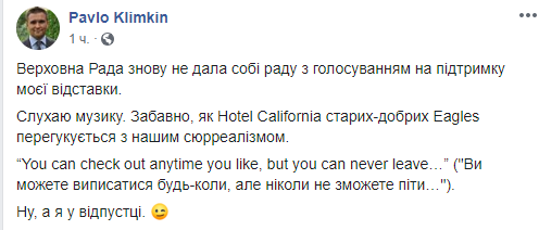 "Слушаю музыку. Забавно, как Hotel California старых-добрых Eagles перекликается с нашим сюрреализмом". You can check out anytime you like, but you can never leave... " (" Вы можете выписаться в любое время, но никогда не сможете уйти... ")", - написал Климкин на своей странице в Facebook.