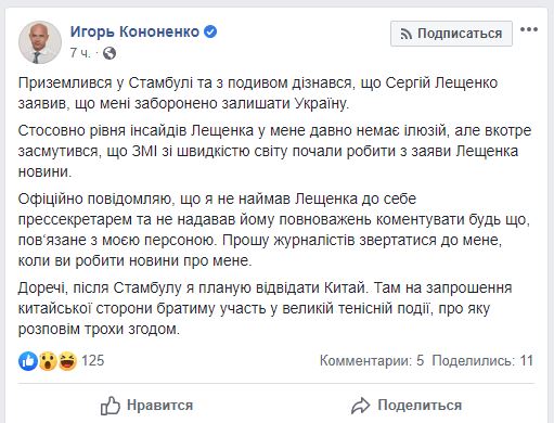 "Приземлился в Стамбуле и с удивлением узнал, что Сергей Лещенко заявил, что мне запрещено покидать Украину. Относительно уровня инсайдов Лещенко у меня давно нет иллюзий, но в очередной раз расстроился, что СМИ со скоростью света начали делать из заявления Лещенко новости", - отметил Кононенко.