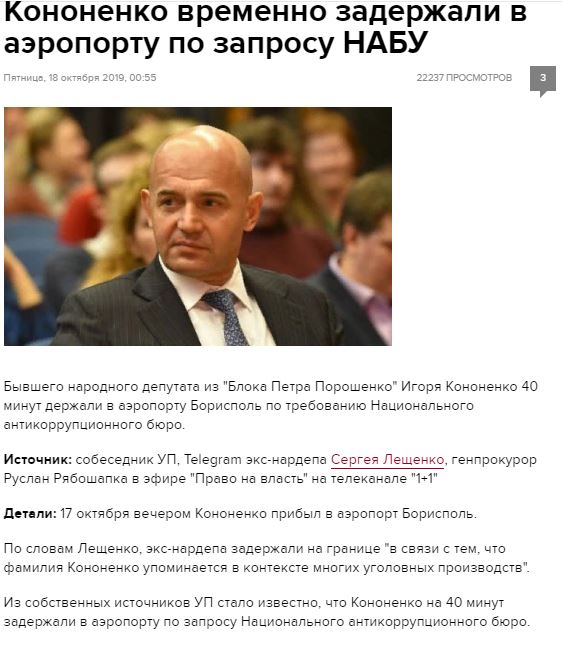 В течение четверга, 17 октября, в интернет-сети обсуждалась новость о задержании бывшего народного депутата "Блока Петра Порошенко" Игоря Кононенко в аэропорту "Борисполь" правоохранителями Национального антикоррупционного бюро Украины (НАБУ).