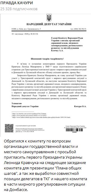"Обратился в Комитет по вопросам организации государственной власти и местного самоуправления с просьбой пригласить первого президента Украины Леонида Кравчука на следующее заседание комитета для презентации "Плана совместных шагов", а так же выработки общей позиции делегатов в ТКГ и нашего комитета в части мирного урегулирования ситуации на Донбассе", - сообщил Качура.