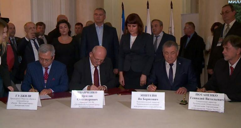 На многих видео с форума он сидит с табличкой "председатель Общества обмена и сотрудничества "Россия – Восточная Европа – Центральная Азия", подписывает с директором "Делового и культурного центра Республики Крым" Ярославом Иванченко и поручается с оккупационным главой Крыма Сергеем Аксеновым.