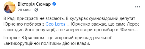 Народные депутаты Украины Гео Лерос и Александр Юрченко устроили драку, на этот раз в кулуарах Верховной Рады. Об инциденте сообщила нардеп от "Европейской Солидарности" Виктория Сюмар на своей странице в Facebook. По словам Виктории Сюмар, Александр Юрченко считает, что именно Гео Лерос навредил его репутации, а не "переговоры о взятке в 40 миллионов". Сюмар подчеркнула, что "история с Юрченко - это яркий пример реальной "антикоррупционной политики" действующей власти".