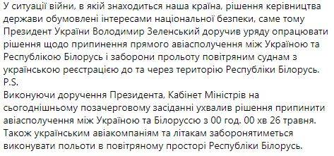 "Именно в этом ряду действий, которые вполне можно назвать проявлением государственного терроризма, — поднятия в воздух для сопровождения посадки рейса Ryanair в Минске боевого самолета Миг-29 белорусских вооруженных сил, — решение, которое могло привести к авиационной катастрофе. В ситуации войны, в которой находится наша страна, решение руководства государства обусловлены интересами национальной безопасности, именно поэтому президент Украины Владимир Зеленский поручил правительству проработать решение о прекращении прямого авиасообщения между Украиной и Республикой Беларусь и запрета пролета воздушным судам с украинской регистрацией до и через территорию Республики Беларусь", — заявил Данилов.