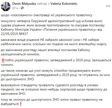 Глава Министерства юстиции Денис Малюська сообщил, что те, кто ждет вступление в силу решение Окружного административного суда Киева относительно отмены правописания, образно говоря, могут расслабиться на некоторое время, так как данное решение в ближайшее время силу не наберет. Об этом он заявил 1 февраля в Facebook.