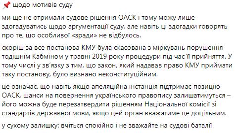 Также он сообщил, что до сих пор не было получено решение ОАСК. Кроме того, по словам Малюськи, если даже апелляционная инстанция поддержит позицию ОАСК, шансы на возвращение украинского правописания будут оставаться. Малюська отметил, что в таком случае правописание можно будет переутвердить решением Национальной комиссии по стандартам государственного языка, если этот орган сочтет это целесообразным.