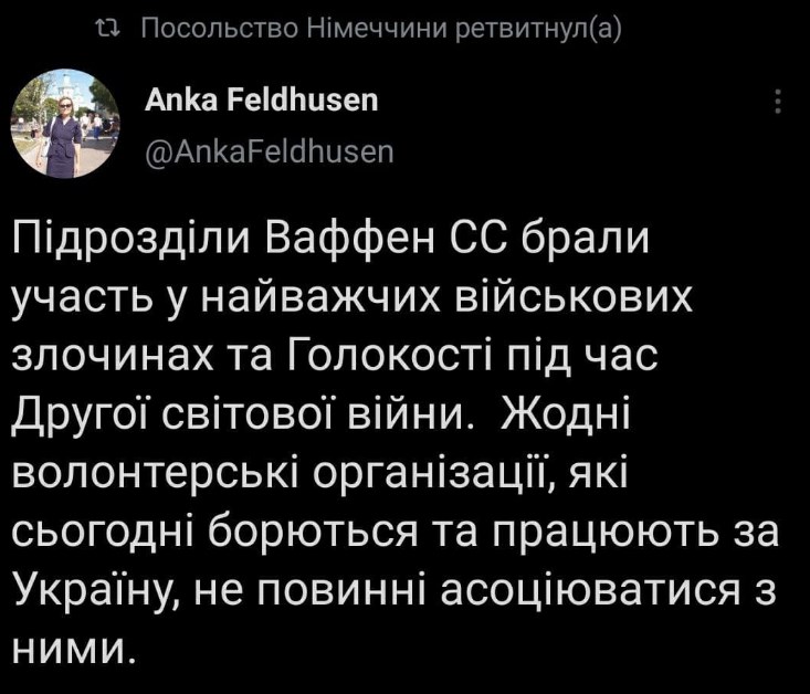 Политики на отметила, что подразделения Ваффен CC участвовали в тяжелых военных преступлениях и Холокосте во время Второй мировой войны. Никакие волонтерские организации, которые сегодня борются и работают по Украине, не должны ассоциироваться с ними.