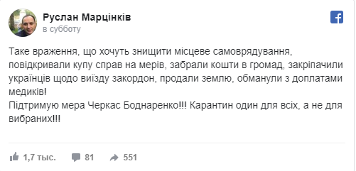 Мэр Ивано-Франковска Руслан Марцинкив не только поддержал Анатолия Бондаренко, но и высказал предположение, что в Украине хотят уничтожить местное самоуправление. Мол, на мэров завели много уголовных дел, в общин отобрали средства, украинцам запретили выезд за границу, продали землю, обманули медиков.