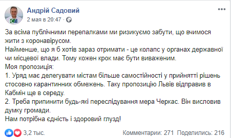 В своей заметке на Facebook губернатор Львова Андрей Садовый попросил "остановить преследование мэра Черкасс", поскольку он передавал мнение общества. Также Садовый убежден, что правительство должно предоставить городам больше самостоятельности в принятии решений относительно карантина.