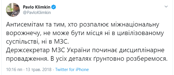 "Антисемитам и тем, кто разжигает межнациональную рознь, не может быть места ни в цивилизованном обществе, ни в МИД... Во всех деталях основательно разберемся", — написал он в Twitter.