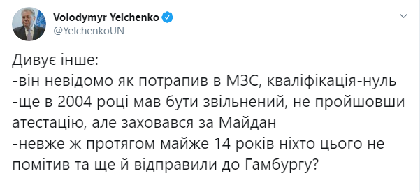 "Еще в 2004 году должен был быть уволен, не пройдя аттестацию, но спрятался за Майдан. Неужели же в течение почти 14 лет никто этого не заметил, еще и отправили в Гамбург?" – отметил постпред Украины в ООН.