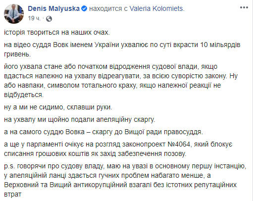 Министр юстиции Денис Малюська заявил, что судья Печерского райсуда Киева Сергей Вовк "именем Украины постановил по сути украсть 10 миллиардов гривен". Речь идет о взыскании с "ПриватБанка" 10 миллиардов гривен в пользу братьев Суркисов.